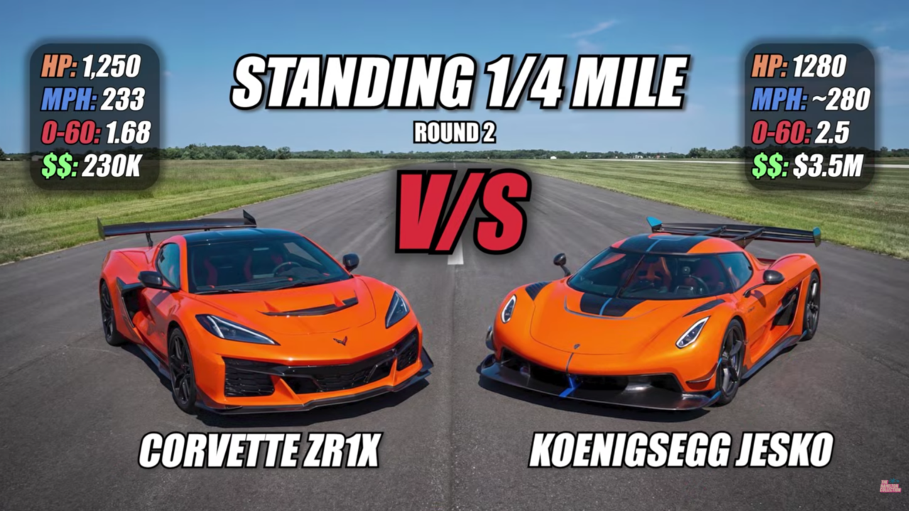 The Swedish hypercar makes 1,280 horsepower on pump gas, costs roughly $3.5 million, and can hit 60 mph in around 2.5 seconds. That should be more than enough to handle a Corvette.