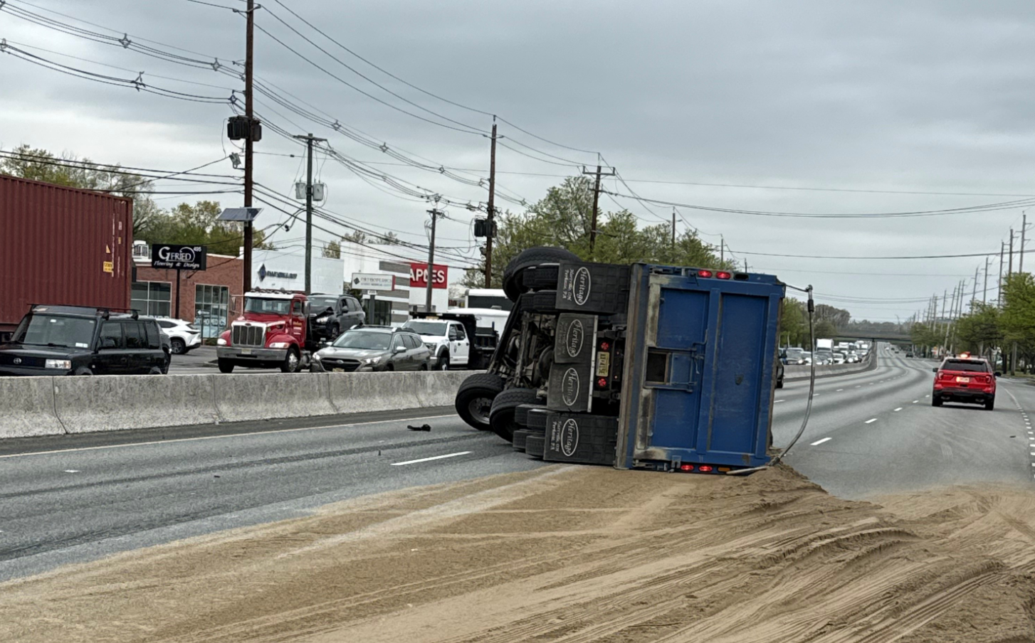 Route 17 in Paramus, New Jersey turned into a messy afternoon detour on Wednesday after a dump truck loaded with dirt flipped over on the northbound side of the highway, shutting down all lanes and sending traffic scrambling for alternate routes.
